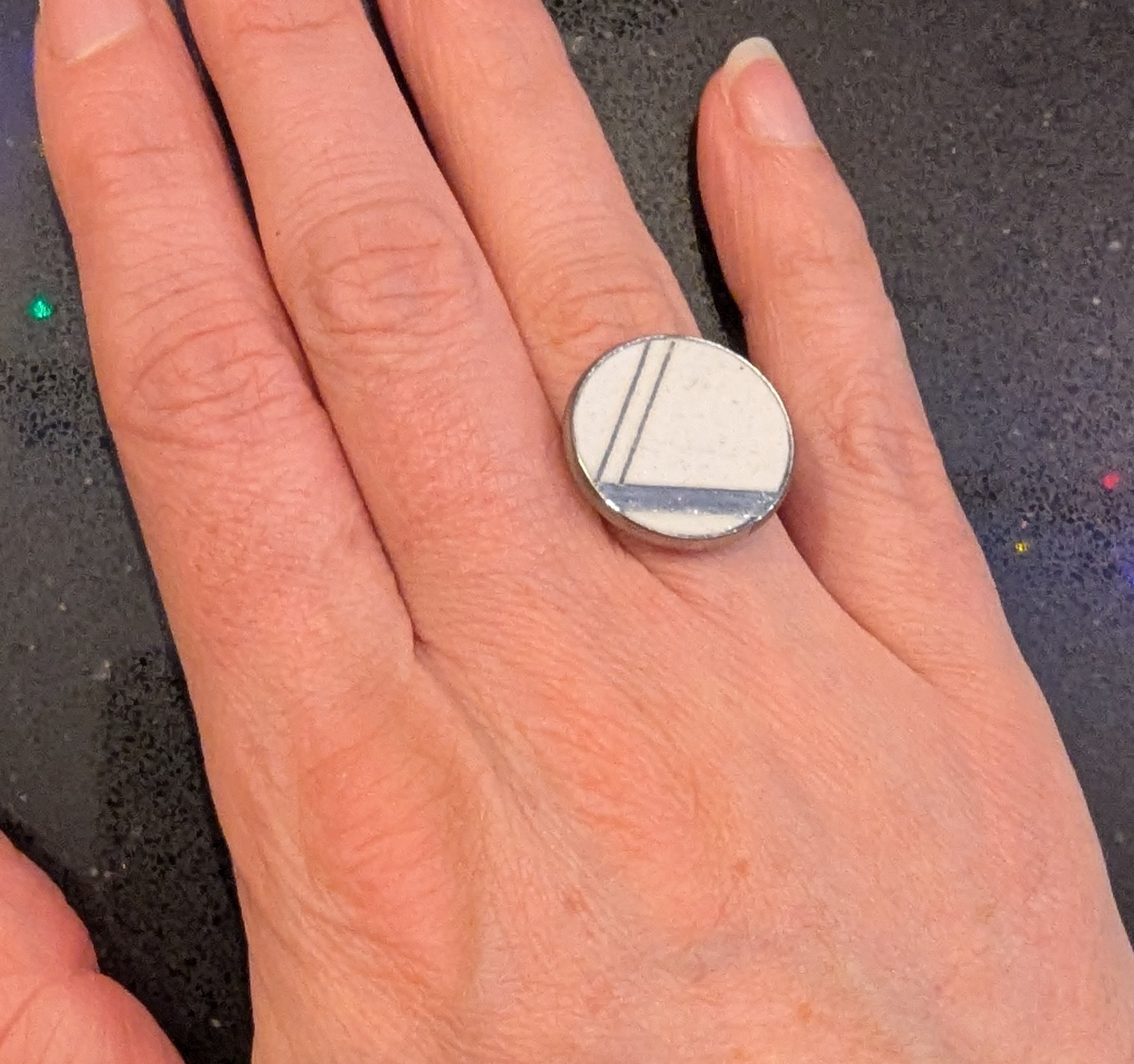 Zilverkleurige ringband die ook verstelbaar is. Witte steen met geometrisch zilverkleurig lijnwerk.