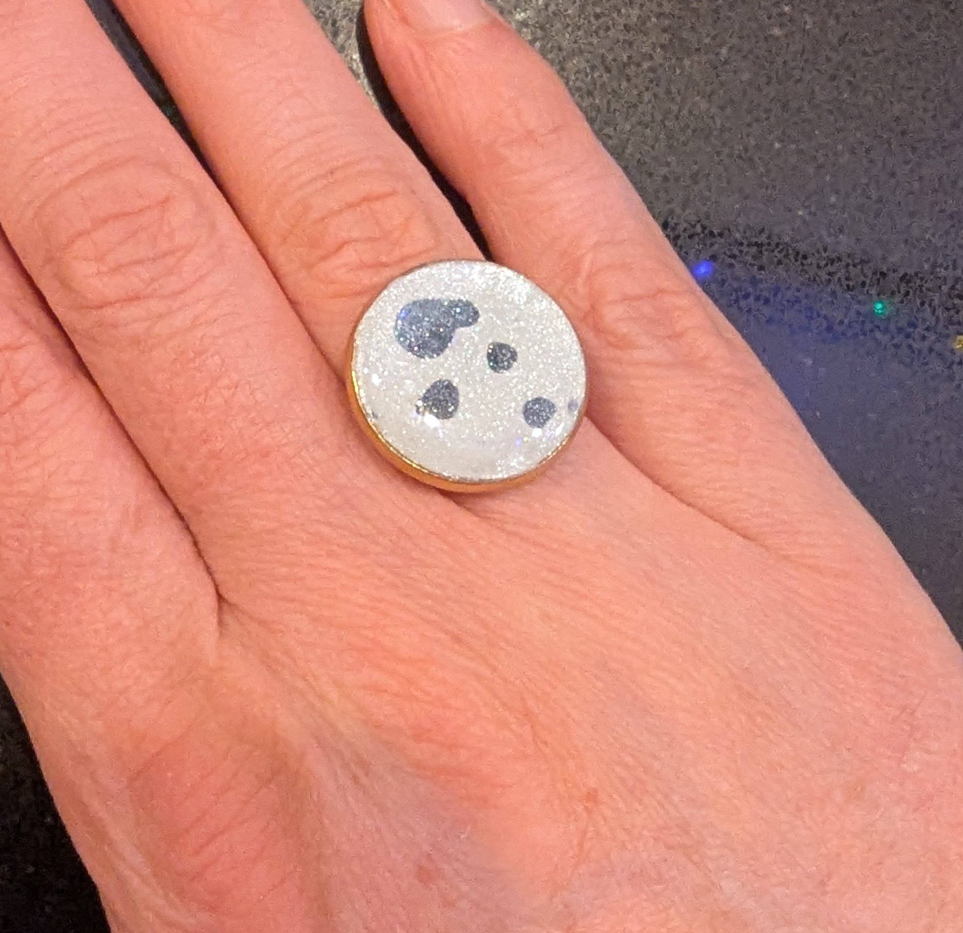 Witte steen met zwarte vlekken en parelmoer afwerking op een goudkleurige ringbasis. Goudkleurige verstelbare ringband.