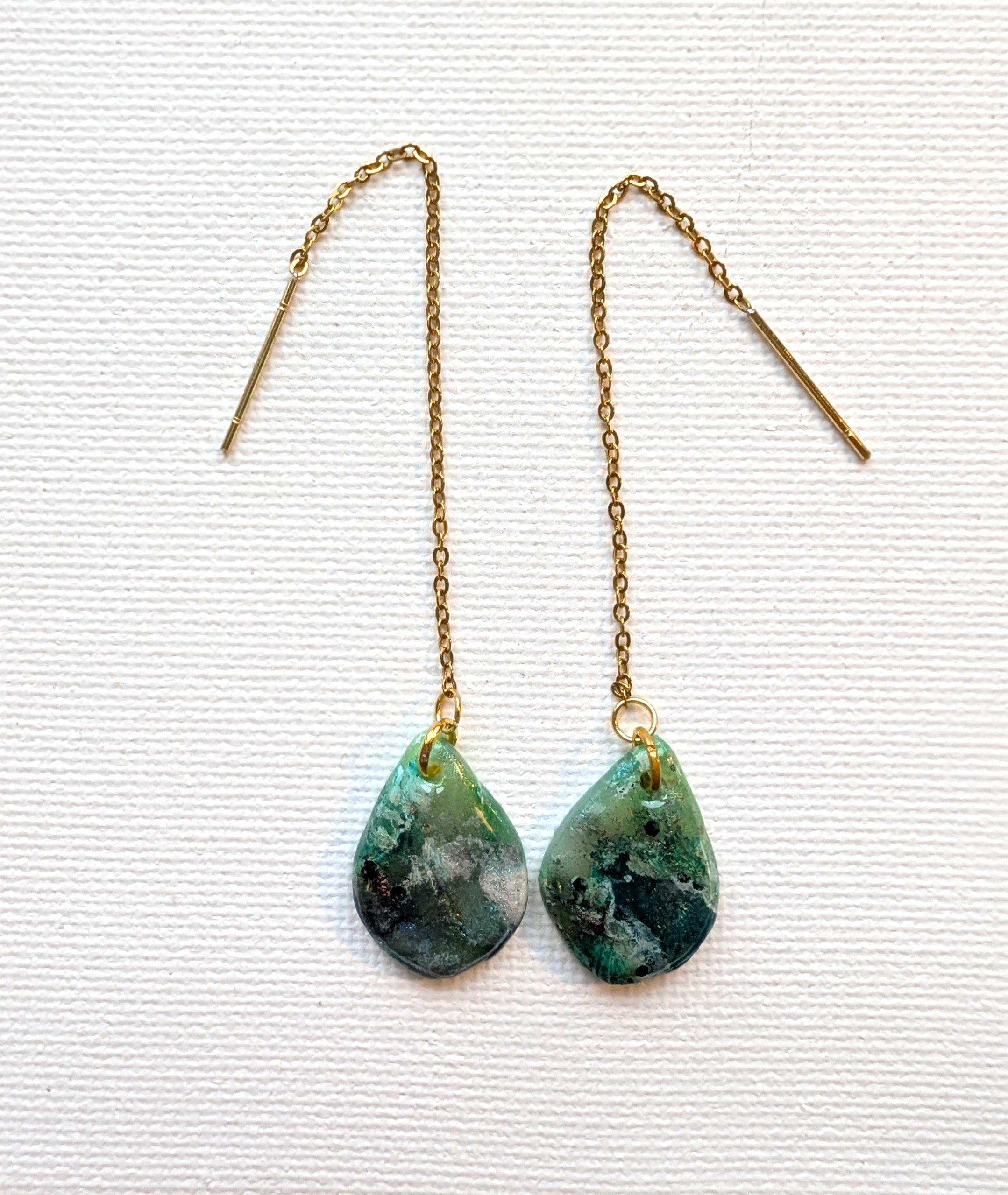 Druppelvormige Faux Jade steentjes aan goudkleurige oorhangers.
